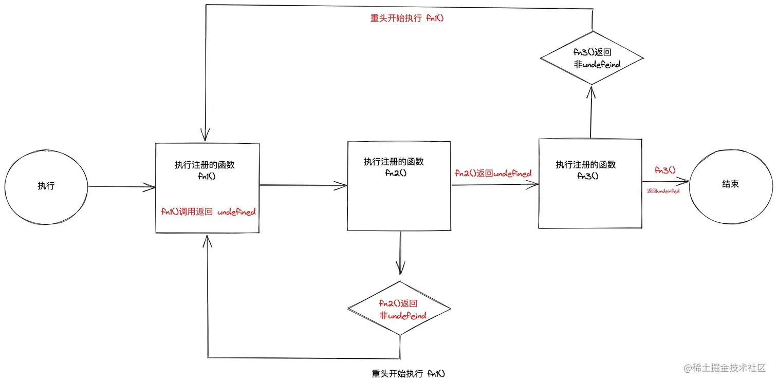 - Loop : 循环类型钩子,循环类型钩子稍微比较复杂一点。循环类型钩子通过 call 调用时,如果任意一个注册的事件函数返回值非 undefeind , 那么会立即重头开始重新执行所有的注册事件函数,直到所有被注册的事件函数都返回 undefined。