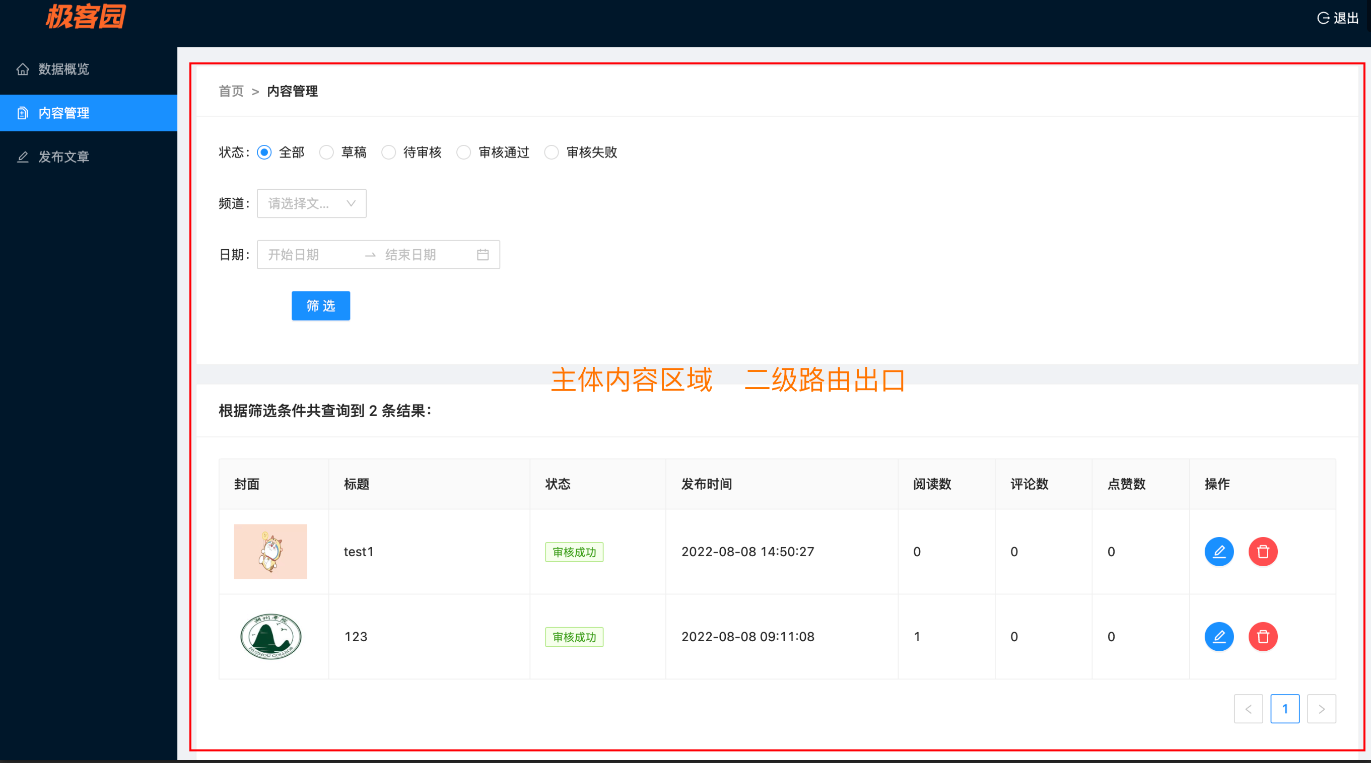 - 准备三个二级路由,分别是数据概览,内容管理,发布文章,在 Layout 组件内部的主体部分实现点击左侧菜单切换二级路由内容显示