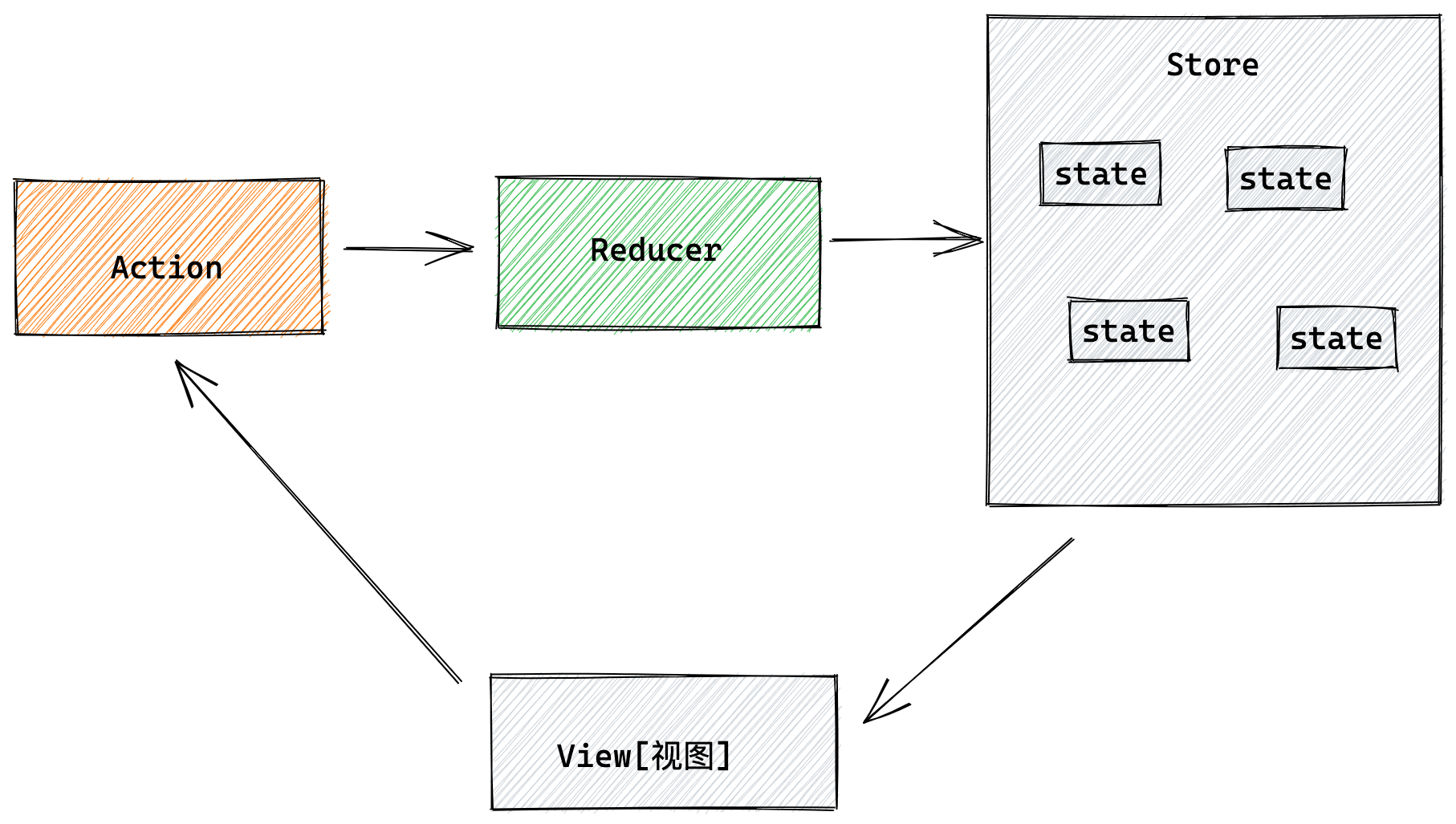 为了职责清晰,Redux 代码被分为三个核心的概念,我们学 redux,其实就是学这三个核心概念之间的配合,三个概念分别是:
