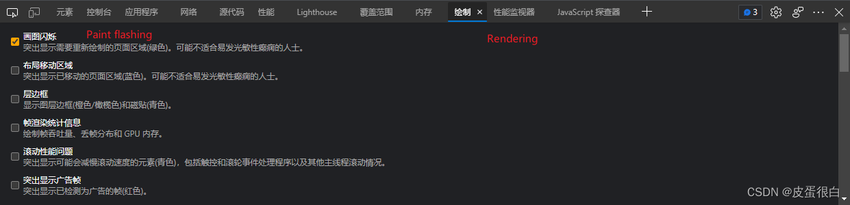 例如 Paint flashing,当我们开启该功能后,操作页面发生重新渲染,Chrome 会让重绘区域进行一次绿色闪动。